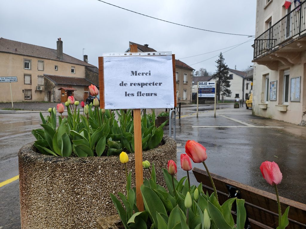 De petites pancartes ont été placées vers les bacs de fleurs pour inciter au respect du travail accompli par les bénévoles du fleurissement.