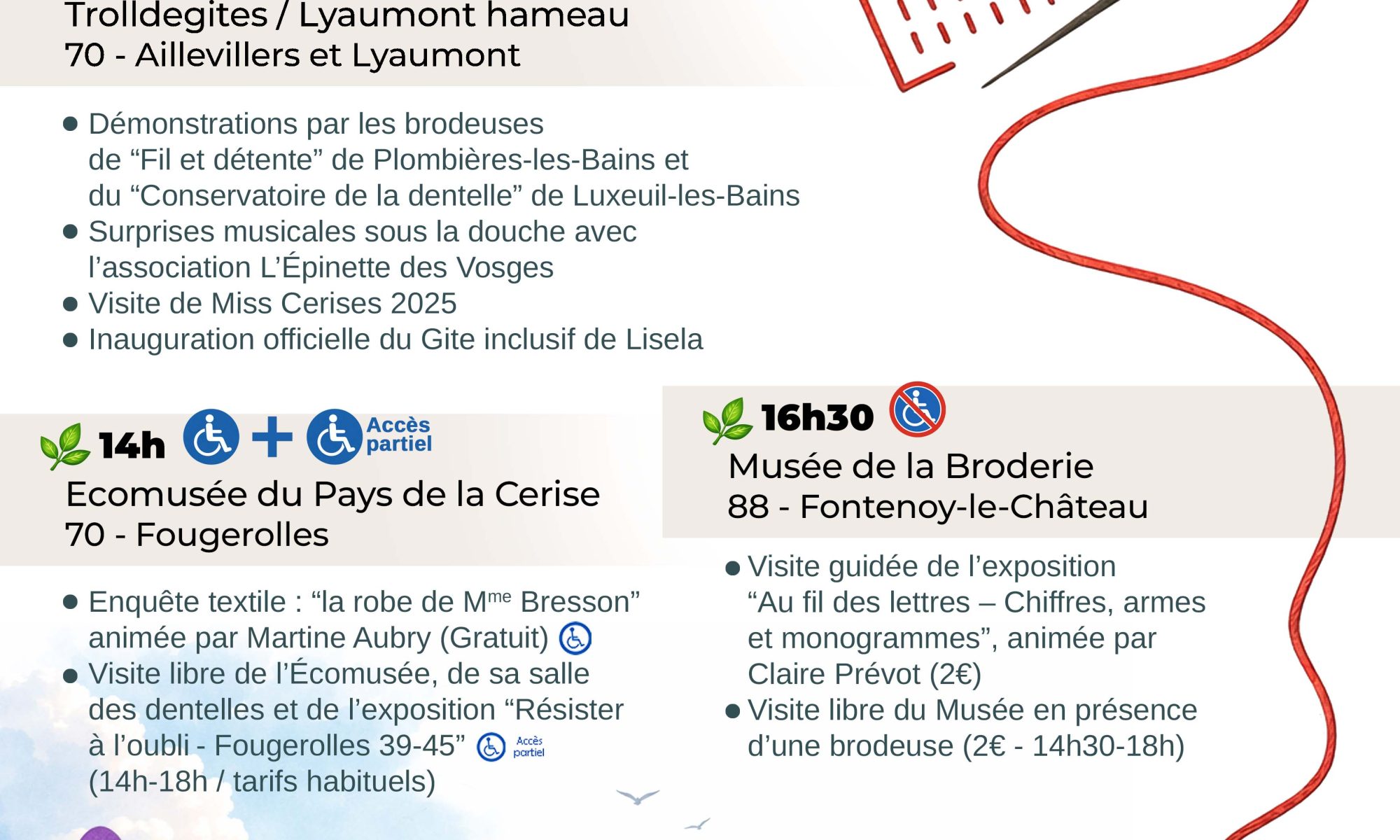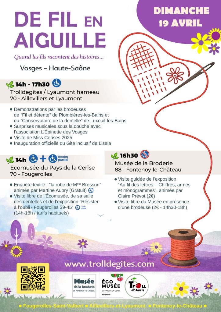 Et si votre dimanche prenait des airs de parenthèse délicate ? Le 19 avril, de 14h à 17h30, trois lieux du territoire célèbrent la broderie et les savoir-faire locaux, de Aillevillers-et-Lyaumont à Fougerolles-Saint-Valbert (Haute-Saône), jusqu’à Fontenoy-le-Château (Vosges). Une après-midi pour admirer le geste précis et découvrir des techniques ancestrales.